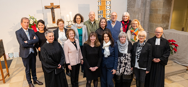 Unser Titelbild zeigt die 14 neuen ehrenamtlichen Seelsorgerinnen und Seelsorger vor dem Altar der Marktkirche. Vordere Reihe links im Talar Assessorin Monika Kindsgrab, die die Beauftragung vornahm; ganz rechts Kursleiter Pfarrer Wilfried Diesterheft-Brehme. Foto: Kirchenkreis Essen/Achim Pohl.