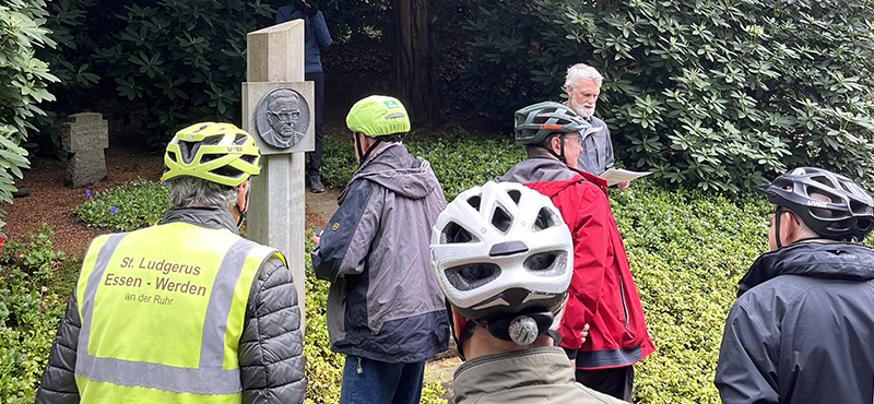 Auf der Atempause-Radtour steuerten die dreißig Teilnehmenden Straßen und Plätze, Gebäude und Gedenkstätten an, die in unserer Stadt an das Leben und Wirken von Gustav Heinemann erinnern – etwa das Gustav-Heinemann-Haus des CVJM Essen und die Gustav-Heinemann-Gesamtschule, das Ehren- und Familiengrab auf dem Parkfriedhof und sein früheres Wohnhaus im Moltkeviertel.