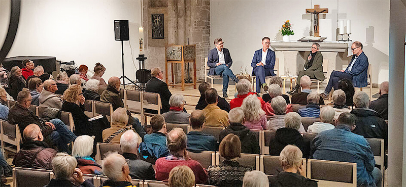 Titelbild: Zahlreiche Gäste verfolgten die Podiumsdiskussion in der Essener Marktkirche. (Foto: Nicole Cronauge/Bistum Essen).
