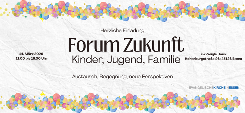 Die Rolle von Kindern, Jugendlichen und Familien in Kirche und Diakonie sind Thema eines Forums Zukunft am 14. März im Weigle-Haus. Die Veranstaltung ist ein weiterer Baustein im Prozess Wandel der Kirche in Essen. | » mehr