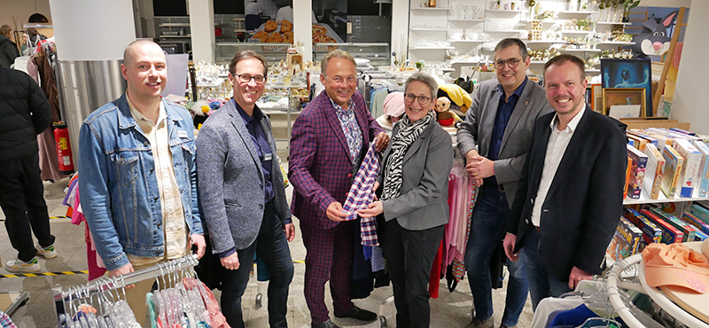 Titelbild: Sie freuen sich über die Eröffnung: Florian Klamma, Abteilungsleiter Diakonieläden der NEUE ARBEIT der Diakonie Essen; Michael Diemer, Fachbereichsleiter Produktion & Vertrieb der NEUE ARBEIT der Diakonie Essen; Michael Stelzner, Geschäftsführer der NEUE ARBEIT der Diakonie Essen; Marion Greve, Superintendentin des Kirchenkreises Essen; Dietmar Gutschmidt, Fachbereichsleiter des Jobcenter Essen; Matthias Jacobstroer, Geschäftsführer der NEUE ARBEIT der Diakonie Essen. Foto: Kirchenkreis Essen/Stefan Koppelmann.