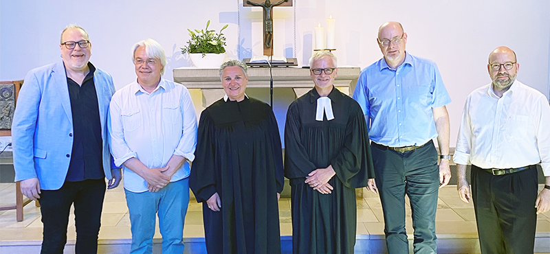 In der Vesper um Vier am 29. Juni in der Marktkirche wurde Pfarrer Dr. Wolfram Jehle (3.v.re.), langjähriger Religionslehrer und Bezirksbeauftragter für den Religionsunterricht an den Berufsbildenden Schulen der Stadt Essen, durch die stellvertretende Superintendentin des Kirchenkreises, Assessorin Monika Kindsgrab, aus seinem Dienst entpflichtet und in den Ruhestand verabschiedet. Gleichzeitig wurde sein Nachfolger, Pfarrer Robert Liess (2.v.li.), als neuer Bezirksbeauftragter eingeführt.