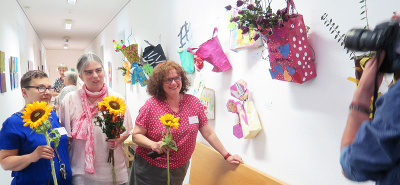 Mut zu haben und sich etwas zuzutrauen, ist das Leitmotiv der Ausstellung. „Kunst heißt immer, inneren Zuständen nach außen hin sichtbaren Ausdruck zu verleihen. Darin unterscheidet sich Kunst von Menschen mit psychischen Erkrankungen nicht von anderer Kunst", erzählte Einrichtungsleiterin Susanne Richter bei der Vernissage. Initialzündung für die Präsentation war die gemeinsame Gestaltung einer Tür für die bundesweite Diakonie-Aktion „Türen öffnen - Gerechtigkeit leben“ zum 500. Jahrestag der Reformation im vergangenen Jahr. „Das hat alle so begeistert, dass wir daraus ganz viel Schwung mitgenommen haben“, blickt Carina Weiß zurück. Die Ergotherapeutin leitet die tagesstrukturierenden Angebote im Haus, an denen sowohl Bewohnerinnen und Bewohner als auch Menschen, die in ihrer eigenen Wohnung betreut werden, teilnehmen.