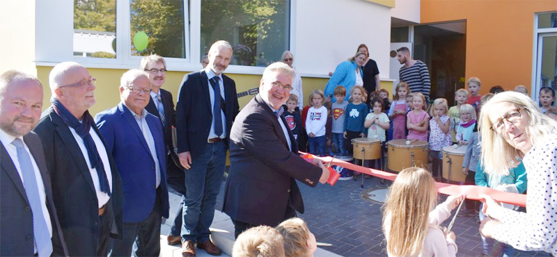 Ihre neuen Räume kann die Evangelische Kindertagesstätte an der Samoastraße in Gerschede schon seit Beginn des neuen Kindergartenjahres nutzen – nun wurde der Neubau, den das Diakoniewerk Essen direkt neben dem bisherigen Standort der Einrichtung errichten ließ, im Rahmen einer offiziellen Feierstunde seiner Bestimmung übergeben. Kita-Kinder begleiteten die Durchtrennung des roten Bandes mit einem musikalischen Paukenschlag.