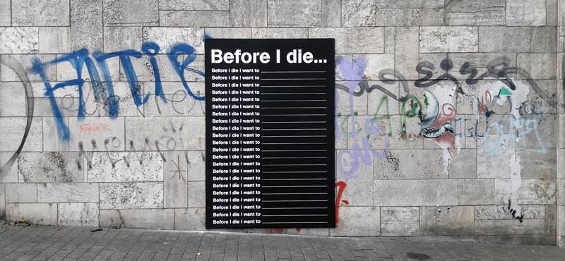 Das internationale Kunstprojekt „Before I Die“ macht vom 25. Oktober bis 17. November im Ruhrgebiet Station. Die Citypastoral am Essener Dom, das Jugendhaus St. Altfrid in Kettwig, das raumschiff.ruhr an der Marktkirche Essen und die Bochumer Citypastoral ITEM laden in ökumenischer Zusammenarbeit dazu ein, über Endlichkeit nachzudenken und eigenen Lebensträumen und Wünschen nachzuspüren.