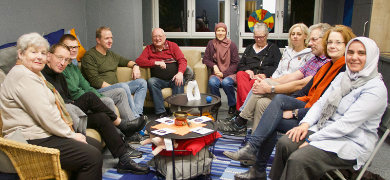 Menschen unterschiedlichen Alters trudeln ein, begrüßen einander herzlich, holen sich Tee aus der Küche und machen es sich bequem – rund um einen großen Tisch oder, was viel häufiger vorkommt, auf gemütlichen Sesseln und Sofas in der „Guten Stube“ des Stadtteilzentrums. Zum Dialog gehören: eine Klangschale, ein kleiner, blauer Ball und eine kleine Skulptur mit zwei Figuren, die einander die Hände reichen. Soviel Symbolik muss sein.