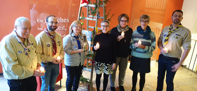 Mit der Aktion „Friedenslicht aus Bethlehem“ setzen die Pfadfinderinnen und Pfadfinder seit vielen Jahren ein klares Zeichen für Frieden und Völkerverständigung. Zum diesjährigen Motto „Mut zum Frieden“ erklären sie: „Der Frieden in Europa und auf der ganzen Welt wird immer wieder auf die Probe gestellt. Aber nicht den Mut verlieren! Zusammen mit anderen ist es oft einfacher, einen langen und schwierigen Weg zu gehen. Wir setzen uns für eine tolerante und friedvolle Gesellschaft und Weltgemeinschaft ein, damit alle Menschen die Chance haben, ein gutes Leben in Frieden zu führen. Mit der Weitergabe des Friedenslichtes möchten wir Mut machen und Hoffnung stiften. In Deutschland und in Europa. Denn jedes Jahr machen wir uns gemeinsam mit vielen Menschen verschiedener Nationen auf den Weg, um das Friedenslicht aus Bethlehem zu uns nach Hause zu holen. Dabei überwindet es einen mehr als dreitausend Kilometer langen Weg über viele Mauern und Grenzen. Es verbindet Menschen vieler Nationen und Religionen. Nur ‚Mut zum Frieden‘!“