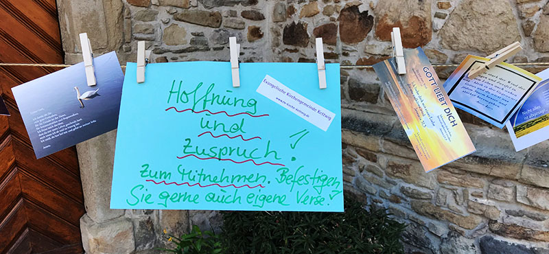 Wie auch vor der Kreuzeskirche in der Essener Innenstadt hängt vor der Kirche am Markt und dem Gemeindezentrum eine "geistliche Wäscheleine" mit Postkarten, die mit stärkenden Worten und Gebeten beschrieben sind; die sonntägliche Predigt hängt zum Mitnehmen in einer Klarsichthülle an der Kirchentür.
