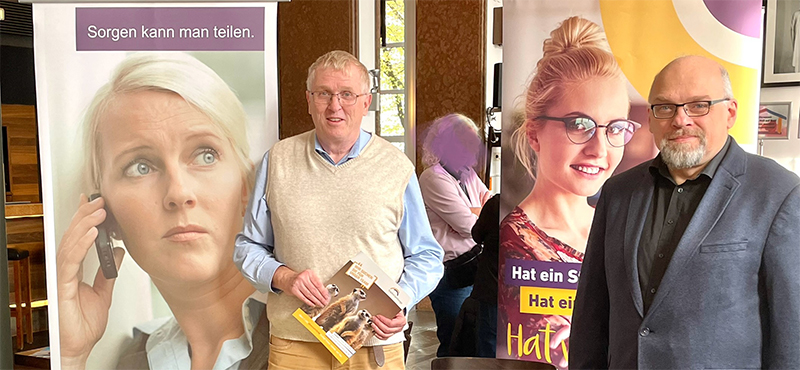 Michael Denzin (re.) und Peter Toussaint vom Vorstand des Fördervereins Essener Telefonseelsorge e.V. (FETS) nahmen sich Zeit und beantworteten gerne die vielen Fragen: Ein Jahr mit 110 Unterrichtsstunden umfasst die Ausbildung. Mehr als 100 Frauen und Männer telefonieren und mailen in Essen 365 Tage im Jahr rund um die Uhr ehrenamtlich mit Menschen in Notlagen. Eine achtstündige Nachtschicht gehört im Monat auch dazu. Und Telefonseelsorger rufen nicht zurück, weil sie die Telefonnummern gar nicht kennen. Die Gespräche sind komplett anonym und für die Anrufenden unter der Nummer 0800 1110111 kostenlos.
