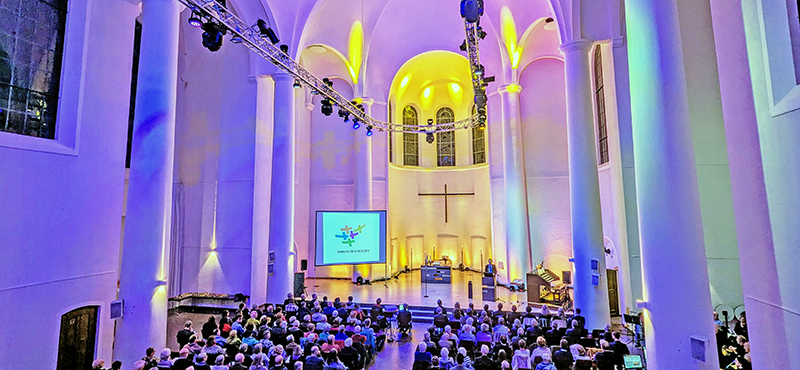 Gerahmt bzw. erweitert wurden die drei Predigtteile durch musikalische Impulse über das Loblied „Du meine Seele, singe“ von Paul Gerhardt. Dabei überzeugten nicht nur die Interpretationen durch Piano und Sologesang, Orgel, Bläser und Vokalensemble: Angeleitet von Kreiskantor Thomas Rudolph, wurde die Gottesdienstgemeinde schließlich selbst zum Chor, erfüllte den großen Kirchsaal mit einem zweistimmigen Kanon und ließ den „Gesang der Seele“ musikalisch zur Decke emporsteigen.